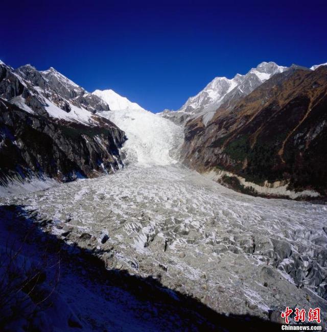 冰川的运动包含内部的运动和底部的滑动两部分,是进行侵蚀、搬运、堆积并塑造各种冰川地貌的动力。但它不是塑造冰川地貌的唯一动力,是与寒冻、雪蚀、雪崩、流水等各种应力共同作用,才形成了冰川地区的地貌景观。图为四川省,贡嗄山,海螺沟的雪山。 黄焱红 摄