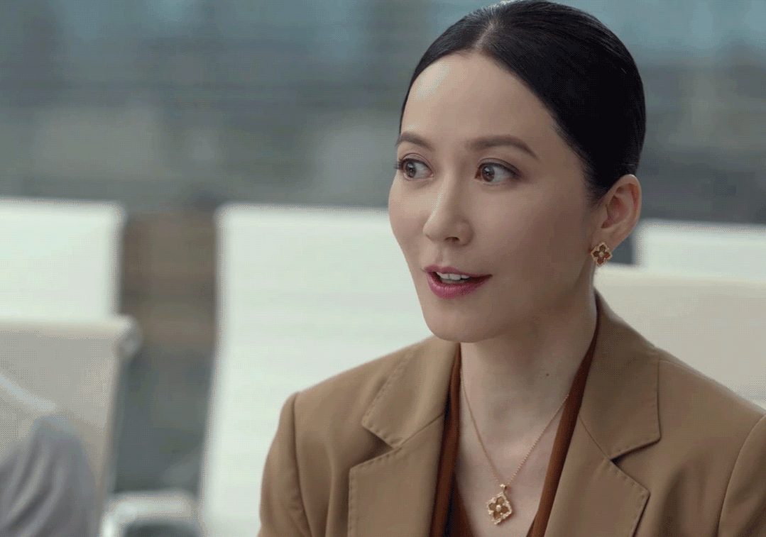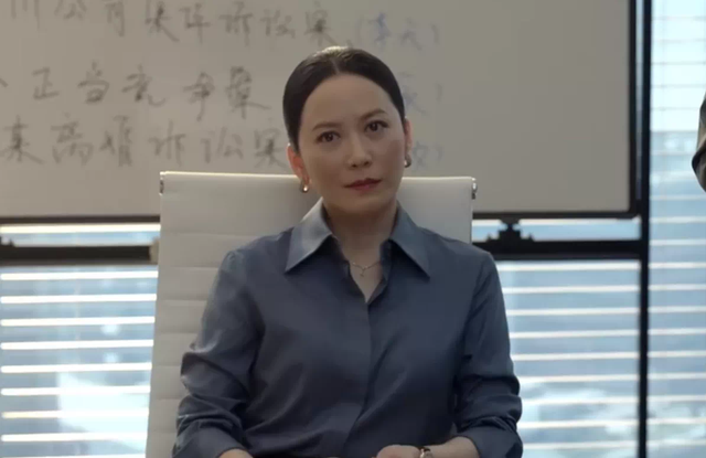 或许是为了突出角色的干练,剧中的她穿着剪裁得体的职业装,还顶着一丝不苟的中分贴头皮发型。