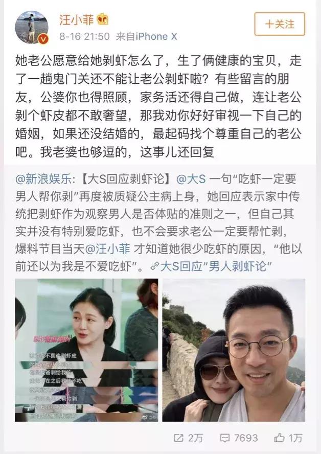 这惹得她又出来解释,自己很少吃虾,更是引出了汪小菲实力护妻,她老公愿意给她剥虾怎么了?
