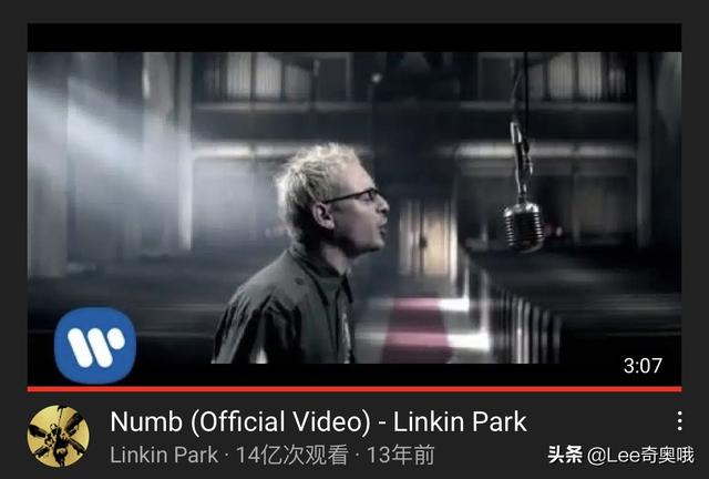 美国著名摇滚乐队Linkin Park(林肯公园)2003年3月发行的《Numb》,截至目前油管播放量14.35亿次,成为世界上播放量最高的摇滚MV。