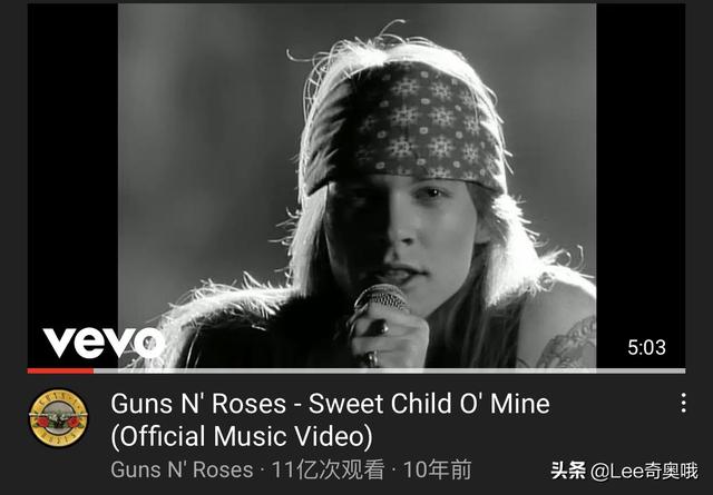 美国著名摇滚乐队Guns N' Roses(枪炮与玫瑰乐队)1988年发行的《Sweet Child O‘ Mine》,截至目前油管播放量11.16亿次,也是首支播放量突破10亿次的80年代MV。