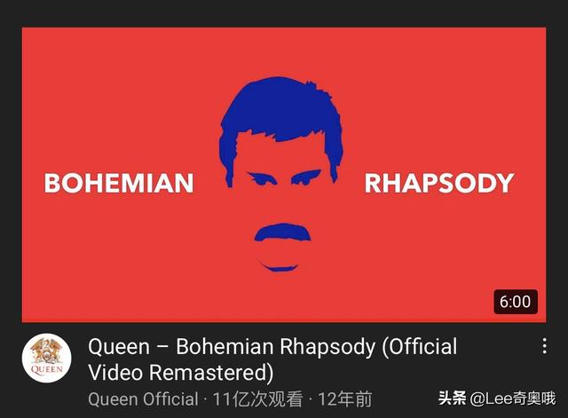 英国著名摇滚乐队Queen(皇后乐队)1975年10月发行的《Bohemian Rhapsody》(波西米亚狂想曲),截至目前油管播放量11.92亿次。