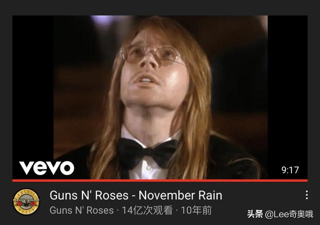 Guns N' Roses(枪炮与玫瑰乐队)1992年发行的巅峰之作《November Rain》,截至目前油管播放量14.15亿次。