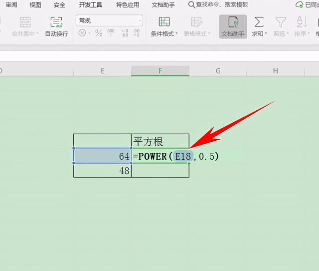 在表格当中输入函数公式=POWER(E18,0.5),POWER函数表示返回给定数字的乘幂。如下图所示: