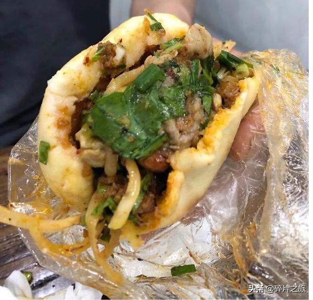 双拼的卡饼正是为“贪吃”的食客们准备的。一个白饼,里面既有肥肠又有粉蒸牛肉,再混合上榨菜、香菜等配料,咬一口不但没有违和感,反而被这层次丰富的味道弄得欲罢不能,一口下去就想赶紧来第二口。