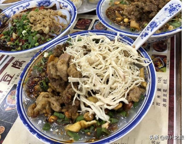 一碗热腾腾的蛋冲豆腐脑配上一个卡饼,下肚后,满足感爆棚。不要小看了这一碗豆腐脑,配料那是相当的讲究,豆花打底,骨汤勾芡,榨菜辅佐,配上粉蒸肉和葱花,最后撒上密料炒制过的黄豆或花生。内容丰富的豆腐脑,无论从视觉还是味觉都是给人以极大的享受。