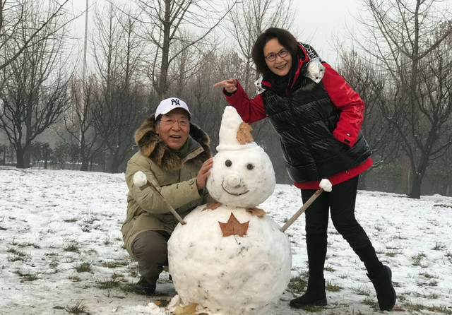 他们养了一只狗狗,叫来福,闲来无事的时候,两人会一起出门遛狗、旅行,下雪了还像年轻小伙子和姑娘一样一起打雪仗、堆雪人,完了还来一张俏皮的合照留念。