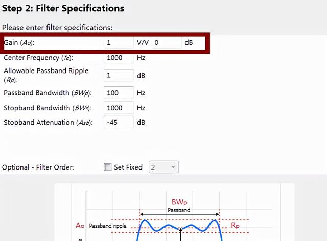 然后点下一步;然后在这里填入我们需要的参数,这里需要说明一点的是有源滤波是可以实现链路增益的,如下图中红色方框中的选项,只需要填入我们需要的功率增益或者电压增益即可。然后就是一路下一步即可。在滤波器形式这里说一下,有巴特沃斯或者切比雪夫等,根据具体情况来选择即可。