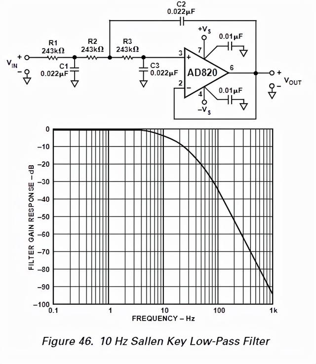 如果大家熟悉运放的话,应该了解一些。很多运放在数据手册里面其实已经给出答案,就是作为滤波器使用的参考电路。如下图: