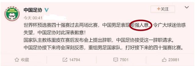因此,结合国家队的战绩,球迷肯定是倍感失望的,所以足协才发道歉信,结果却写成了:国足的表现大体上还是能让人感到满意,只有球迷倍感失望。