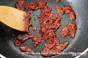 10.将豆瓣酱放入锅中,小火煸炒出红油