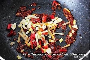 11.加入剁碎的葱姜蒜和干辣椒
