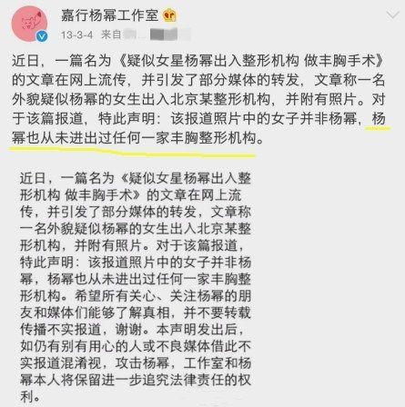 问题是,杨幂真的隆胸了吗?曾传出杨幂出入整形机构丰胸,工作室辟谣,表示“杨幂从未进出过任何一家丰胸整形机构”。
