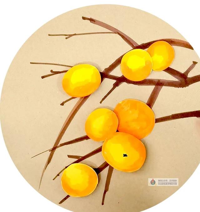 2.在创作中,小朋友们通过对桔子色彩的观察和感受,将深浅不同的黄色进行叠色表现,巧妙地表现出了桔子鲜艳而明亮、丰富而整体的色彩美感;在背景表现上,运用剪贴和绘画的形式表现出树枝和叶子的造型,画面富有粗细、大小的穿插变化。整幅作品构图别致、形式新颖,充满了诗情画意。