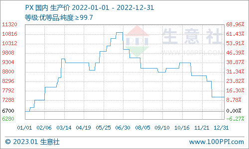 国内PX市场价格与原油走势基本相似,年初均价为6700元/吨,年末均价为7450元/吨,全年涨幅为11.19%。2022年上半年国内新装置投产较少,加之亚洲部分地区装置意外停车,致使国内PX供应紧张,此期间经济不断复苏,终端纺织行业开工率逐步上涨,对于上游需求增加,PX价格走势上涨。下半年,国内新投产装置大部分产能在下半年正常出产品,国内供应增加,加之亚洲停车装置逐步开车,供应充足致使PX价格大幅走低。