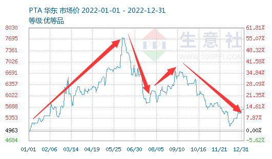 据生意社监测,2022年PTA现货市场价格呈现“M”型走势,其中年末市场均价为5616元/吨,较年初4963元/吨上涨13.16%。最高点出现在6月9日为7751元/吨,较1月1日最低点,上涨了56.19%。具体来看: