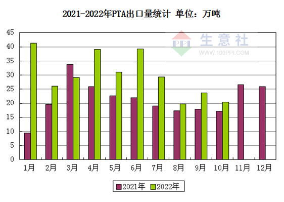 2022年PTA产能利用率偏低,供应增量相对有限。另外,PTA新增产能集中在年底,产量释放有限,而出口量进一步攀升,因此2022年PTA整体呈现去库状态,截至2022年12月初,PTA社会库存187万吨,较年初减少138万吨。