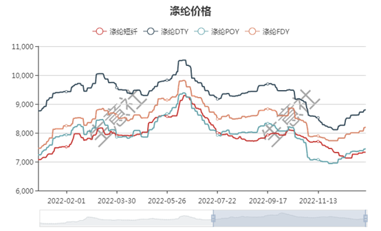 需求端:下游聚酯市场,涤纶各产品价格跟随原料走势基本一致,其中涤纶FDY全年上涨7.95%、涤纶短纤上涨3.18%、涤纶POY上涨2.01%,涤纶DTY下跌0.54%。