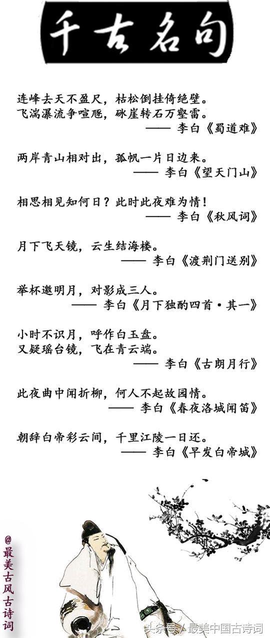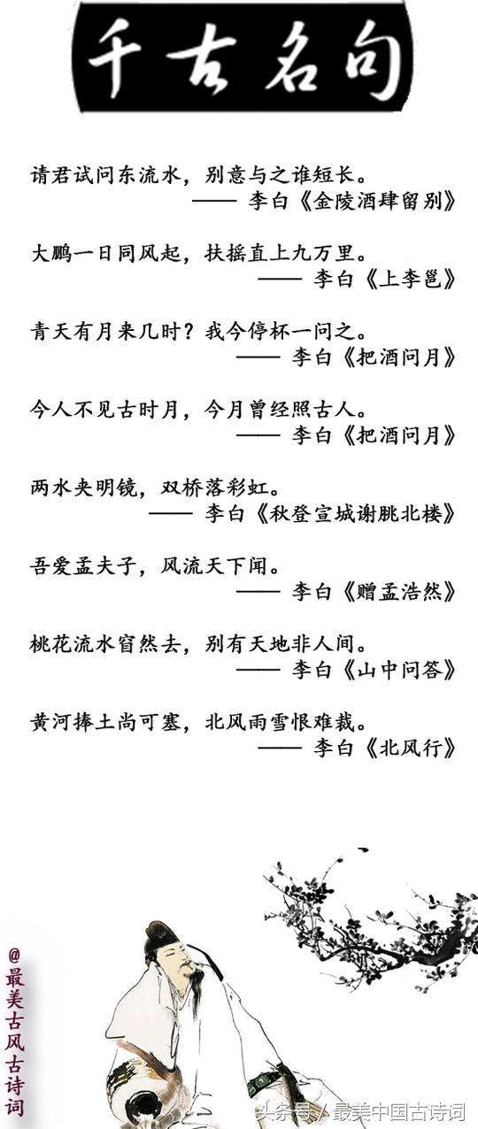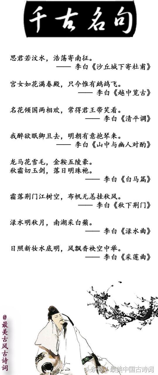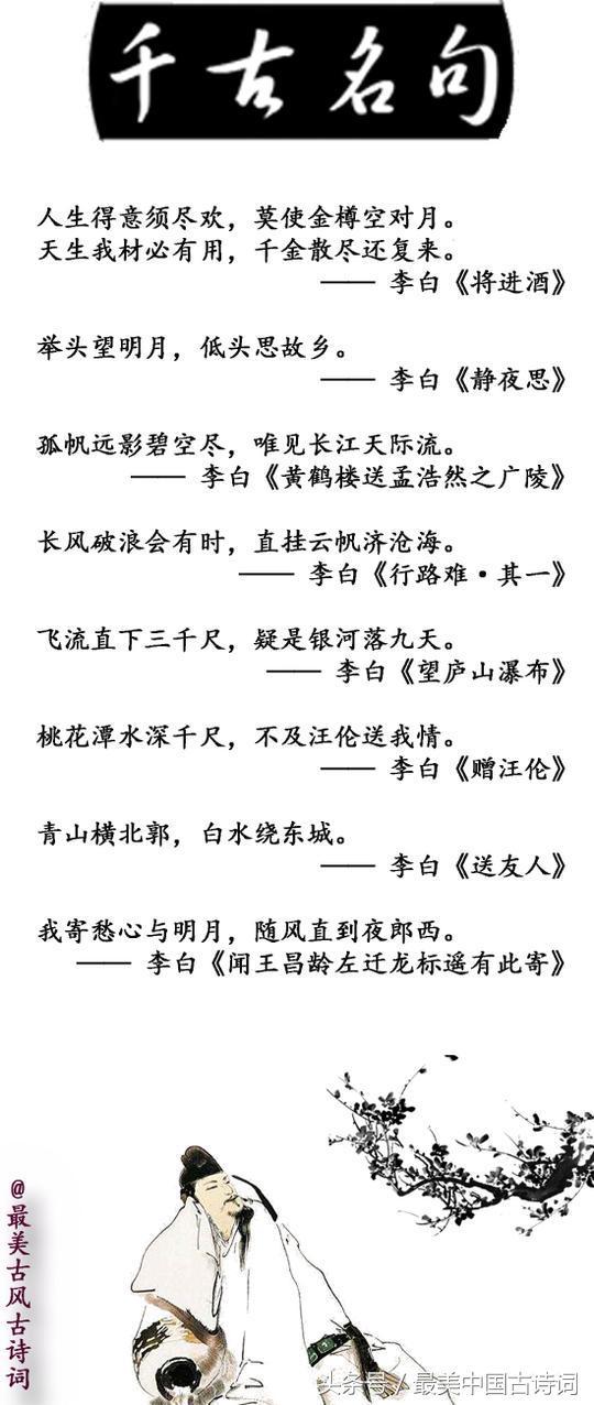 【诗仙李白的千古名句】①我本楚狂人,凤歌笑孔丘。②仰天大笑出门去,我辈岂是蓬蒿人 。③云想衣裳花想容,春风拂槛露华浓。④抽刀断水水更流,举杯消愁愁更愁......诗仙李白的诗词名句你知道多少?