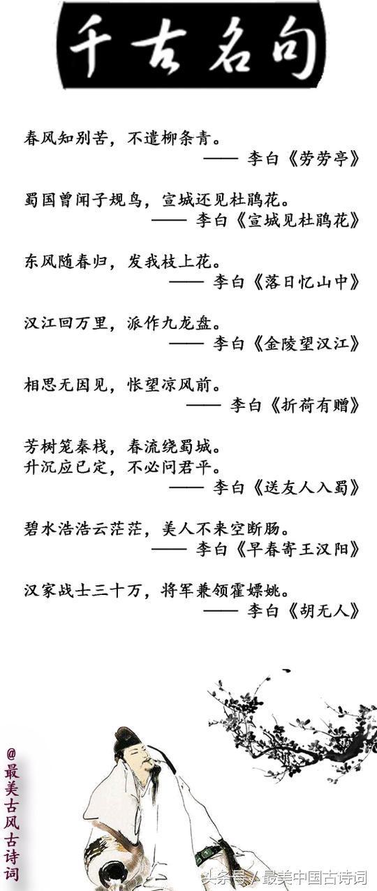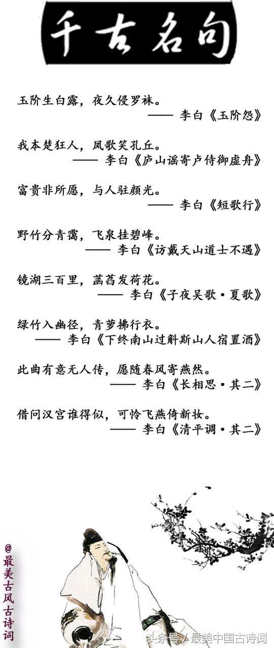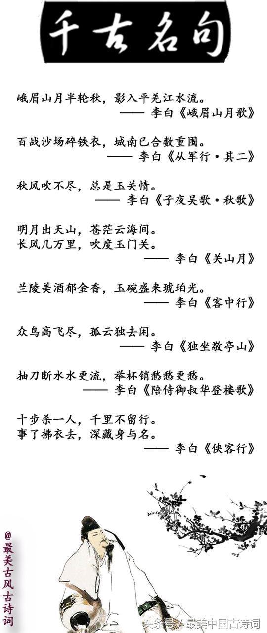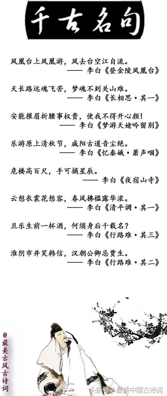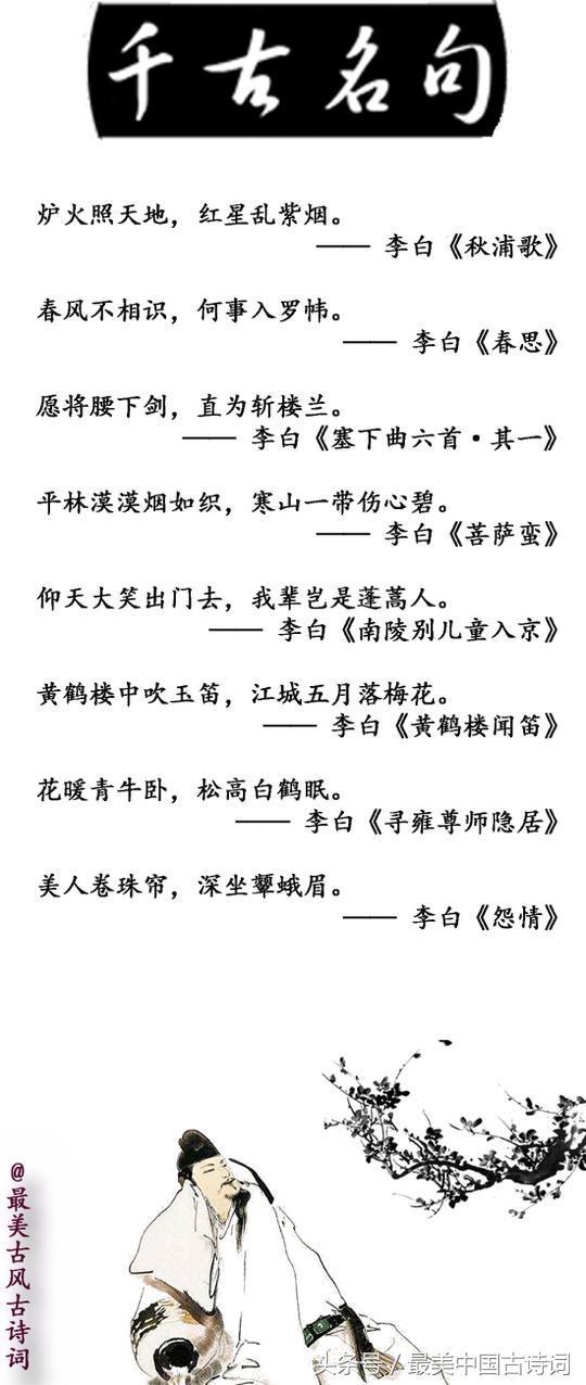 【诗仙李白的千古名句】①我本楚狂人,凤歌笑孔丘。②仰天大笑出门去,我辈岂是蓬蒿人 。③云想衣裳花想容,春风拂槛露华浓。④抽刀断水水更流,举杯消愁愁更愁......诗仙李白的诗词名句你知道多少?