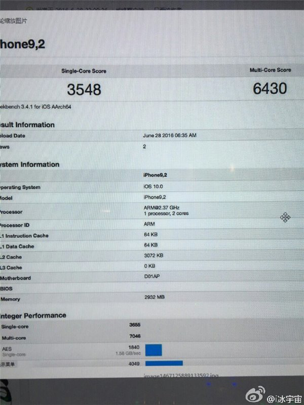 在八月初的时候,有网友@i冰宇宙在网上曝光了一张疑似A10处理器的GeekBench跑分图,从图上可以清楚的看到,这款A10处理器主频为2.37GHz,双核心设计,A10处理器的单核跑分为3548分,多(双)核跑分为6430,尤其是单核跑分成绩,已经超过了此前A9X处理器的多核5466/单核3244的跑分,当然也远将骁龙820甩在身后,多核跑分同样惊人,按照目前来看,高通821都有可能不是其对手。