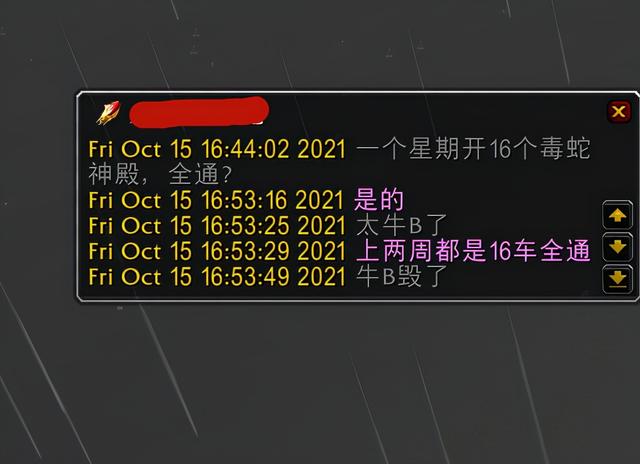 今天碰到一个“神级”公会,为啥说是“神级”公会呢?因为这个公会连续两周的时间,每周会开出16个毒蛇神殿和风暴要塞全通团。并不是野团那种击杀了踏潮者和大奥术师的全通团,而是成功击杀了瓦丝琪和凯尔萨斯的全通团,就问你这样的公会算不算“神级”公会?公会的名字祥子哥不方便透露,下图是这个公会喊话的内容,大家可以仔细地看一看,再慢慢地品一品。并且大家在猜测一下,一周开16个毒蛇全通团,到底是真的,还是为了吸引玩家和消费老板的一个噱头。