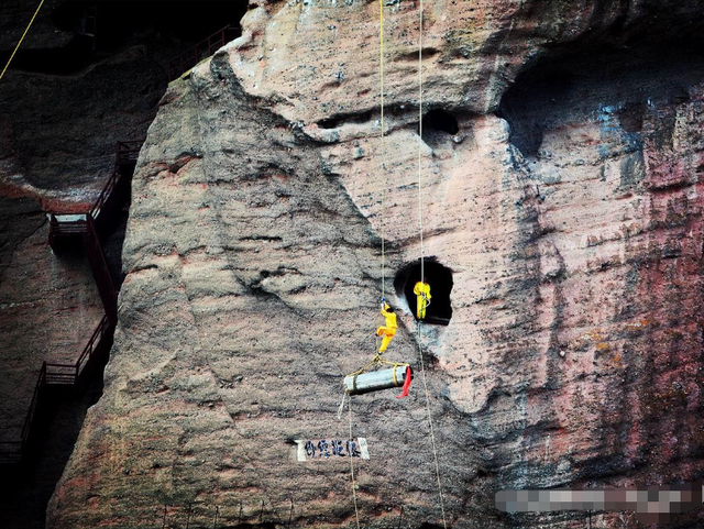 再一个,虽然龙虎山有很多采药人,常年上山采药,有些身手好的也能爬到洞里头,但是龙虎山的洞穴上上下下的分布,没有规律,不可能所有的洞穴采药人都能到得了,所以这个方法基本也不成立。还有人出招,说将绳子和滑索搭成纵横交错的样子,仿照织布的原理,将装置固定在悬崖上方,下面拉动绳子把棺材运上去。但是这个方法和上头的一样,经不起推敲。还是那个问题,将装置固定在悬崖上方是怎么固定的?还是需要很大承受力的。再有,有人说,是不是古人建造了栈道,把棺材运上去之后,再把栈道拆了呢?但是专家在崖壁上找不到固定栈道的眼,所以这个方法也被pass掉了。