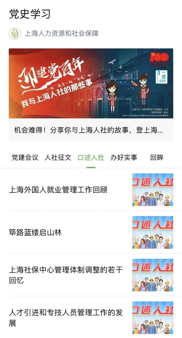 点击“人社互动-党史学习”功能栏,打开“口述人社”专栏,听上海人社人亲述发展中的温暖故事吧!
