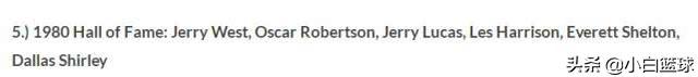 1980年NBA名人堂:杰里-韦斯特、奥斯卡-罗伯特森、杰里-卢卡斯、莱斯-哈里森、埃弗雷特-谢尔顿、达拉斯-雪莉。韦斯特老爷子至今都还是NBA的logo,虽然有人建议在科比逝世后将科比的标志性动作改为NBAlogo但联盟却没有通过,韦斯特生涯1冠+1FMVP+1得分王+1助攻王+1一防1二防+10一阵2二阵,他足够伟大;除此之外大O是NBA历史上第一个场均三双的后卫,生涯1MVP+1冠军+6助攻王。杰里-卢卡斯也是七届全明星+1冠;