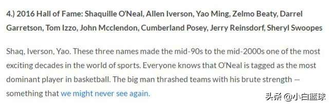 2016年NBA名人堂排在第四:沙奎尔-奥尼尔、阿伦-艾弗森、姚明、泽尔莫-比蒂,达雷尔-加雷森,汤姆-伊佐,约翰-麦克伦登,坎伯兰-波西,杰瑞-雷恩斯多夫,谢丽尔-斯沃普斯。这一届最为伟大的球星就是奥尼尔,沙克是NBA历史上最具统治力的中锋,如今的神魔佛皇鲨只有奥尼尔这个位置不是该位置的历史第一,因为他的荣誉不如贾巴尔,但联盟认可奥尼尔的实力,他若生在贾巴尔时代他必然超过贾巴尔,再加上有NBA历史上唯一一个1.83米四届得分王+MVP的艾弗森,身高2.26米的中国巨人姚明,这一届的名人堂足够有份量。