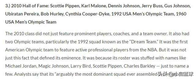 2010年的NBA名人堂排在第三:斯科特-皮蓬、卡尔-马龙、丹尼斯-约翰逊、杰里-巴斯、格斯-约翰逊、乌比拉坦佩雷拉、鲍勃·霍利、辛西娅·库珀-戴克。杰里-巴斯是现任湖人老板珍妮-巴斯的父亲,他为紫金军团奉献一生,他打造了紫金王朝;皮蓬则跟随乔丹拿下了6个总冠军,皮蓬是NBA历史上最出色的二当家没有之一,生涯6冠+1抢断王+8一防2二防+3一阵2二阵2三阵;卡尔-马龙虽然生涯无冠,但他拿下了两个常规赛MVP,NBA得分榜目前也排在第二。