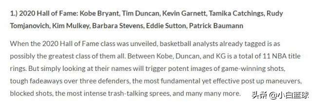 2020年名人堂排在第一:科比-布莱恩特、蒂姆-邓肯、凯文-加内特、塔米卡-凯金斯、鲁-·汤姆贾诺维奇、金-穆基、芭芭拉-斯蒂文斯、埃迪-萨顿、帕特里克-鲍曼。当大家知道科比、邓肯、加内特进入名人堂时就知道这一届的名人堂会是最伟大的,因为有三个常规赛MVP一同进入名人堂,科比与邓肯还是MVP+FMVP,科比是SG位置第二人,邓肯是PF位置第一人,加内特是PF位置前五,这三人一同入选48次全明星,科比是最接近神的篮球,他在篮球运动上的影响力已经不逊于乔丹,科比乐于分享,联盟有太多的年轻人都受过科比的点拨,加上科比在奥斯卡获奖,这一届的名人堂必然是历史最伟大的。
