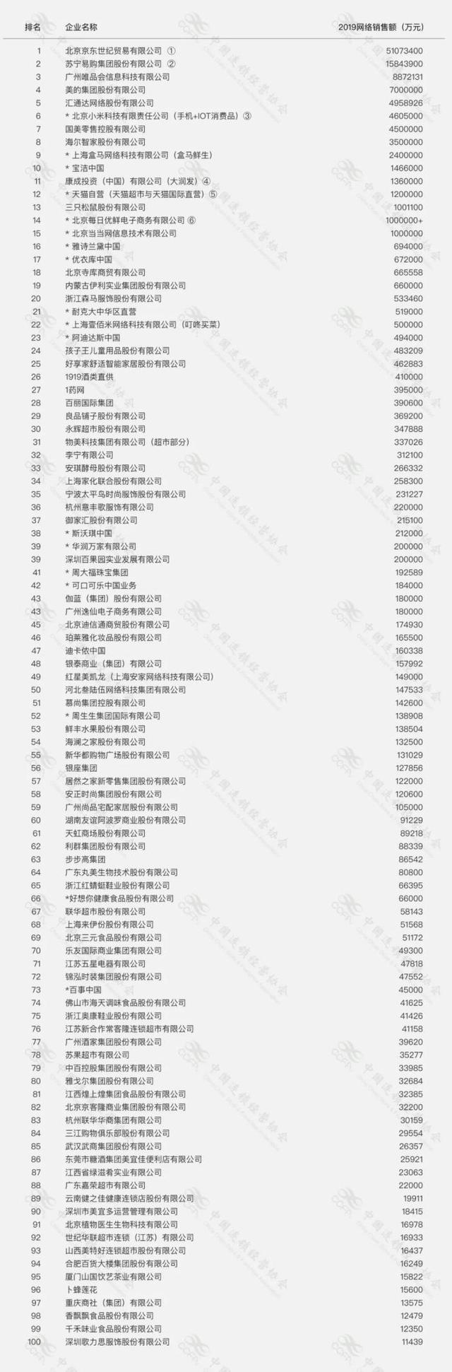 2020中国网络销售TOP100榜单由中国连锁经营协会与德勤共同调研制定,排名以2019财年网络销售额为主要依据,数据来自中国连锁经营协会问卷调查、公司公开信息、上市公司财报、新闻稿等材料以及行业分析报告、交易记录估算,新闻访谈等。