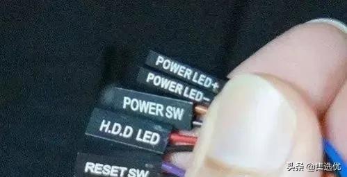 这是前面板插线接口,插口线一般都有提示的,主板的Power(电源开关)、Reset(重启开关)这几种设备是不分方向的,只要弄清插针就可以插好。而HDD LED(硬盘灯)、POWER LED(电源指示灯)一定要插正确,区分正负极即可。如下图所示