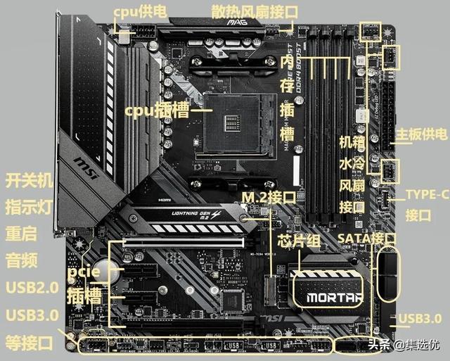 CPU插座、内存插槽、显卡插槽、M.2插槽、SATA插槽、其他PCIE插槽、风扇接口。