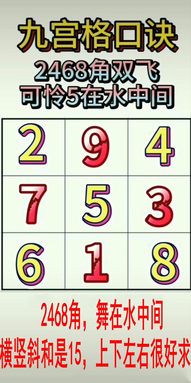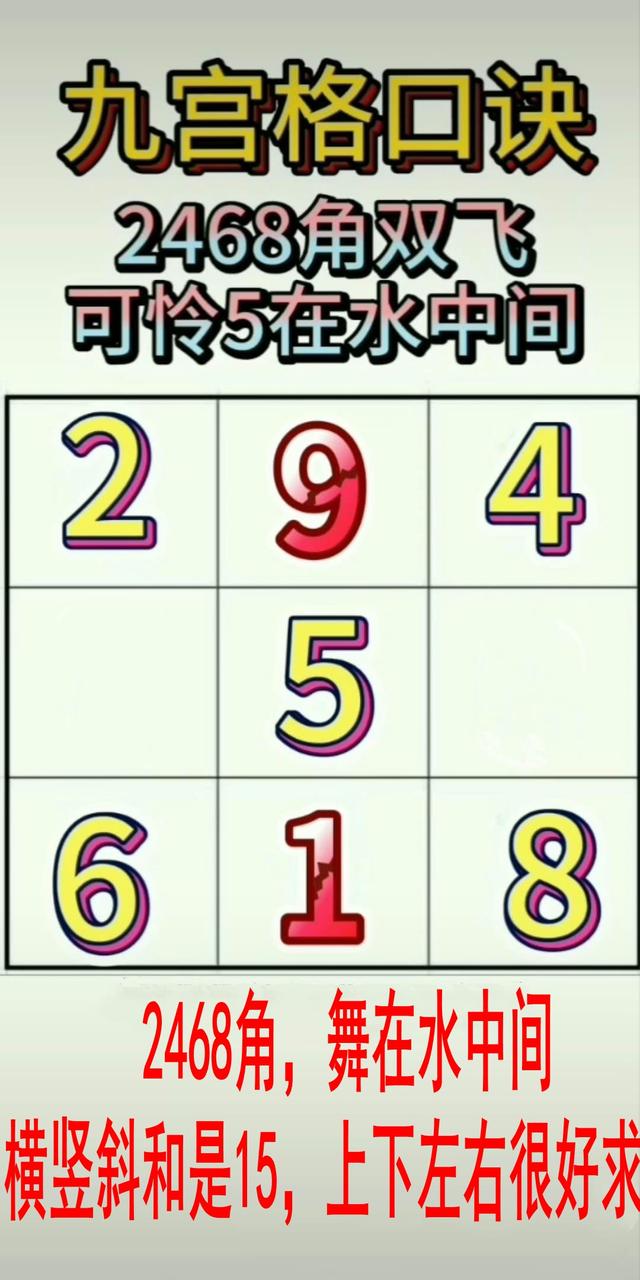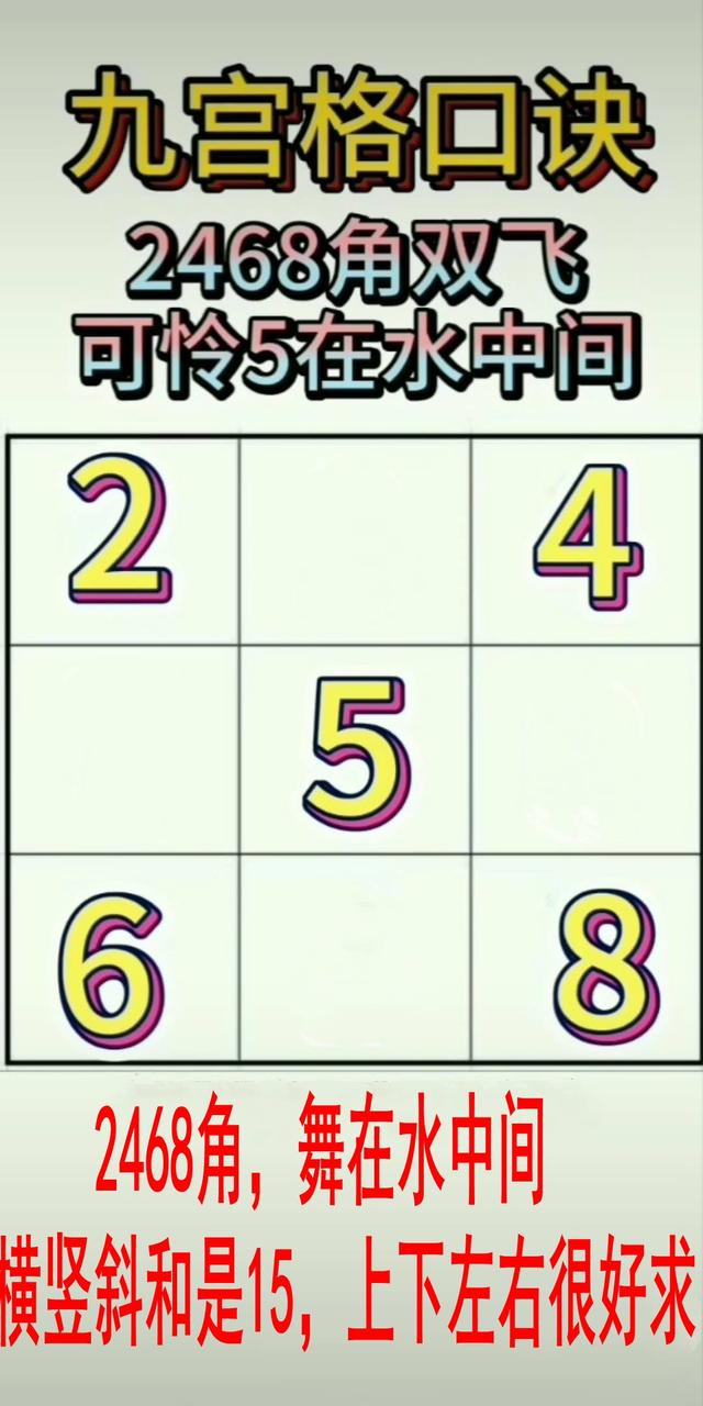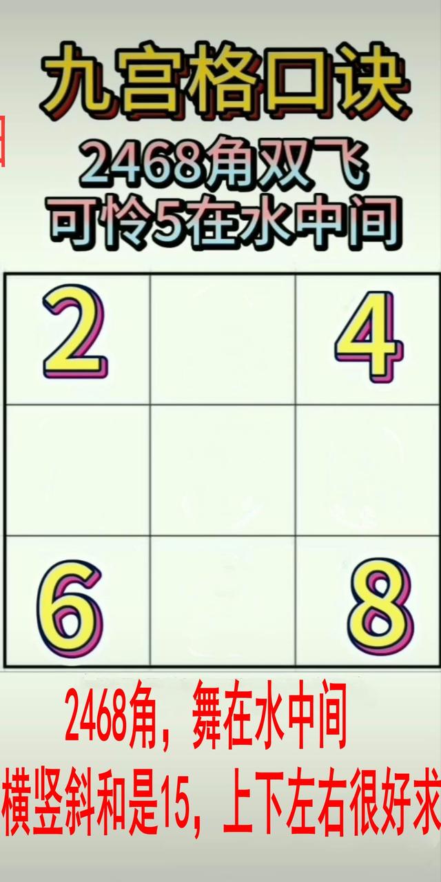 改编代口诀一:2468角,舞在水中间。横竖和15,上下很好求。
