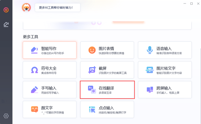 该软件除了输入功能以外,还有许多的附加实用小工具,例如:在线翻译、图片表情、智能写作等,其中就有我们需要的翻译工具,只要打开搜狗工具箱,选择“在线翻译”,接着将要翻译的内容复制粘贴到空白处,最后按下翻译键就完成啦!操作也很简单,电脑有这个应用的小伙伴,可以试试看。