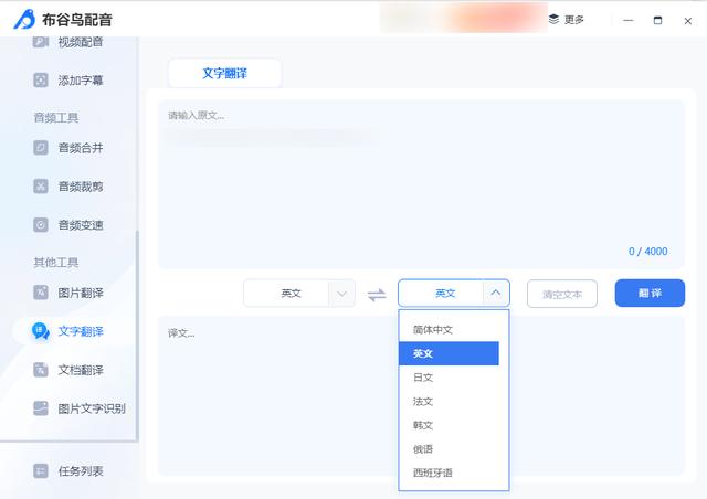 它不单单是一款配音软件,还可以实现音频合并、图片转语音、文字翻译等操作。其中,它的“文字翻译”功能支持中文、英文、法文等八种语言进行互译,并且采用了AI智能翻译,从而能够确保翻译的准确,还能够一键清空文本和一键复制翻译出来的文本,这些小工具给大家在翻译的过程中带来了诸多的便利,如果大家需要翻译的文本内容较多,可以尝试使用该软件。