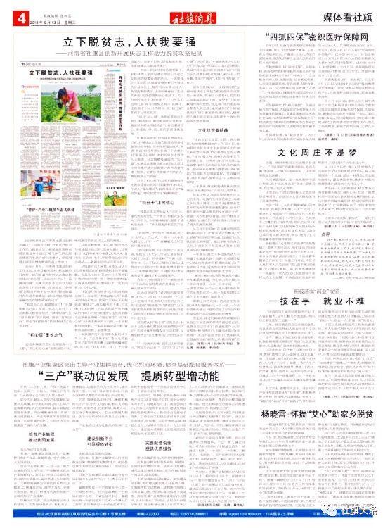 “在‘千企帮千村’工作中,杨晓雷面向贫困户招工,并高于非贫困户10%工资对其发放。至目前,已有56名农民在他合作社里务工,其中贫困户23人,已脱贫7户。”该村支部书记张弘弹介绍说。“既然回来了,就要把这项造福家乡的事情做好。”谈起未来发展,杨晓雷充满信心。(原载6月5日《南阳晚报》 王绍亭)