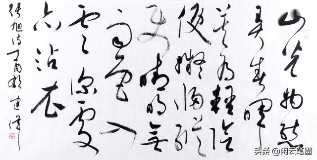何开鑫的这幅字字形无不歪斜,字与字之间错落有致,摇曳生姿,墨韵生动。