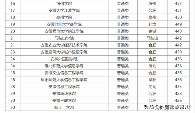 由于自三年前,安徽高考本科将二本,三本合并在一起,故而此名单之中,包含着一些三本院校。图中可以看出,合肥师范学院在三十所院校中分数位列第一,其次是安徽中医药大学。投档分最低的是安徽三联学院以及皖江工学院,分数为426分。
