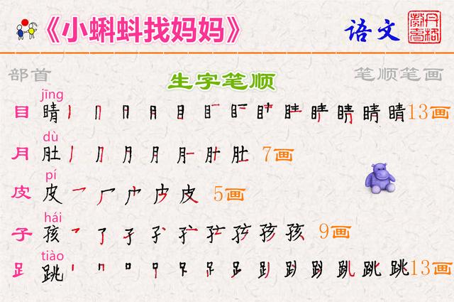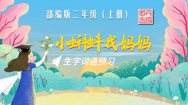二年级第1课将要学习的课文是《小蝌蚪找妈妈》,是作者方惠珍、盛璐德等写作的课文,曾经还被改编成一部深受欢迎的水墨动画。今天就先来预习一下本课的生字和词语吧: