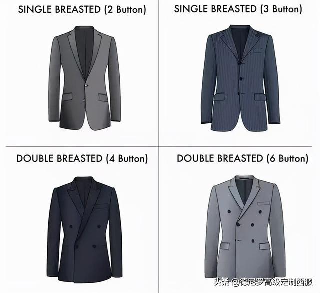 不同款式会根据西装的设计版型而做出调整。西装有一个叫“NEVER”的纽扣法则,对于两粒扣、三粒扣的西装,最后一粒扣永远不扣。