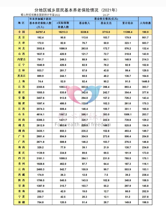 近日,国家统计局公布了2021年度的城乡居民养老保险数据,全国城乡居民养老保险的人均养老金水平达到了190.9元。