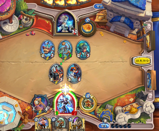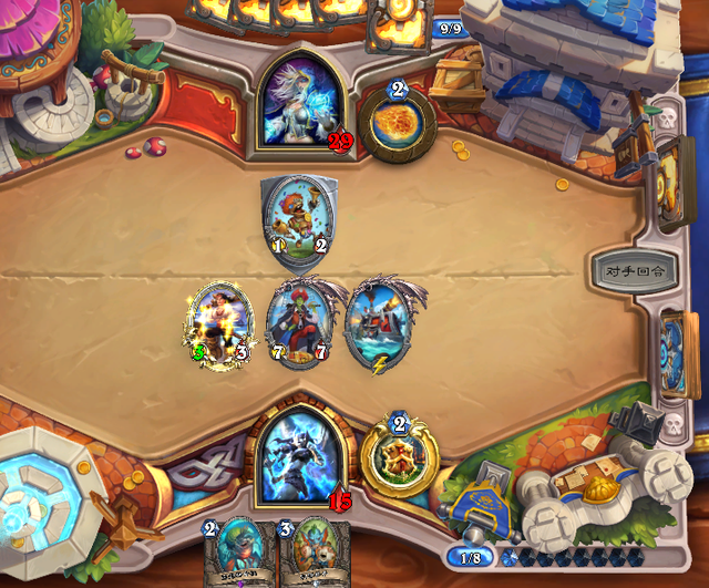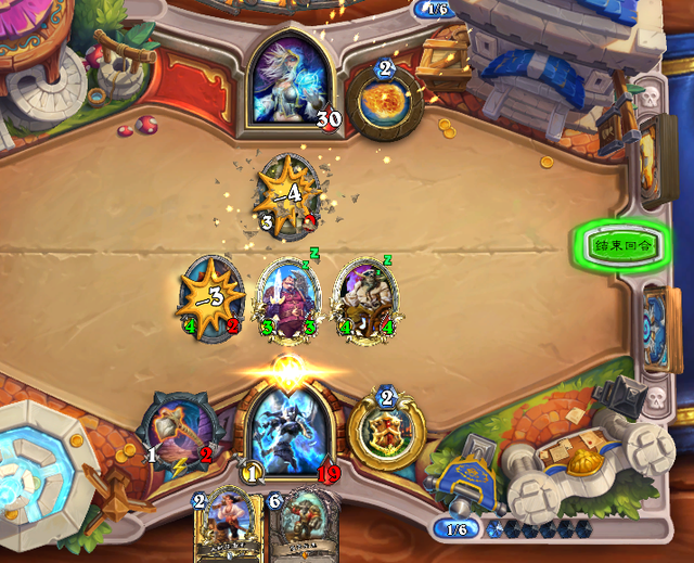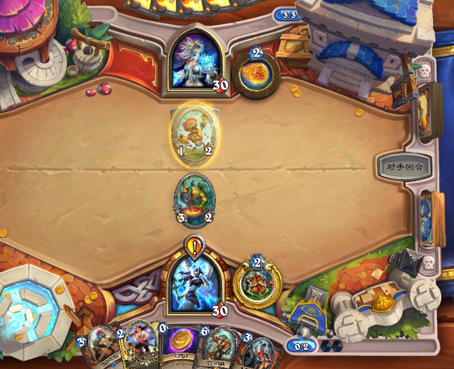 虽然战士打德鲁伊上限很高,但是打机械法或者快攻骑这种进攻型卡组就需要很多细节上的操作了,以这把法师对局为例和大家聊聊在面对这种快攻内战时候应该如何处理。我这把打的就是同为快攻的机械法,前期我俩节奏基本上都是一样的,1费一个挂任务一个过,到了2费阶段我们就要进行细节上的比拼了,战士前期在没有拿到武器的情况下最好的节奏就是按费拍怪,根据费用来拍出相应的随从,在4费之前只要稳住即可,毕竟法师4费之前的解场能力并不强。