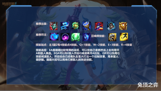 EA是璐璐比较常用的连招,可以给自己套盾然后上去利用平A和敌人换血。EQA可以先E敌人然后Q减速再平A拉扯。QR可以先用Q技能减速敌人,然后给自己或者队友套大打出一个控制效果,用来留人很舒服。璐璐大招可以用来打断敌人的突进技能。