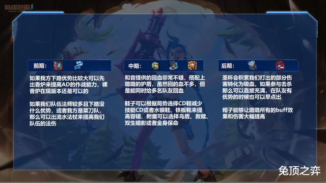 璐璐出装是非常灵活并且好理解的,AD优势就先出香炉、法师优势先出流水法杖、均势可以先出和音或者圣杯,最后一件可以做帽子让所有增益效果提高一个等级。