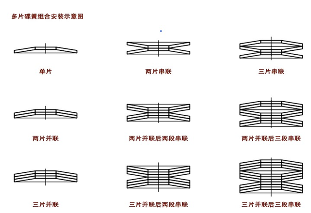 碟簧使用变化很多,可同向叠法使用、反向叠法使用、或者正反向叠法混合使用。碟形弹簧多片使用时,无论安装在导杆上还是在导孔内,导杆和导孔表面必须平滑,且表面硬度需>55HRC,碟簧安装时与导杆、导孔之间应留有适当间隙,并做润滑。防止长时间摩擦造成碟簧疲劳失效。不同情况下的安装方式,具有不同的弹力效果。