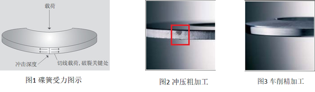 结合图1、图2,如果冲压毛刺、锐边不去除,碟簧在使用中极易沿冲压方向产生切向载荷,造成应力集中导致碟簧破裂。