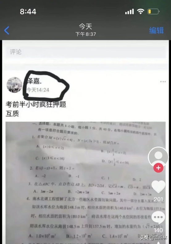 但无法解释的是,众所周知,高考结束后答题卷自不必多说,就连出题卷都是要回收的,那这张试卷又是在什么时间点被如何被拍下来的呢?